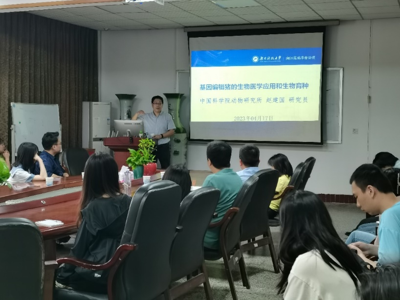 报告会上,赵建国教授讲述了通过化学诱变技术,进行猪全基因组水平的随机突变和表型分析,并对相关突变类型进行了详细分析,构建了相关疾病的大动物模型。随后,赵教授介绍通过基因编辑技术进行猪的基因组进行遗传编辑的最新进展。