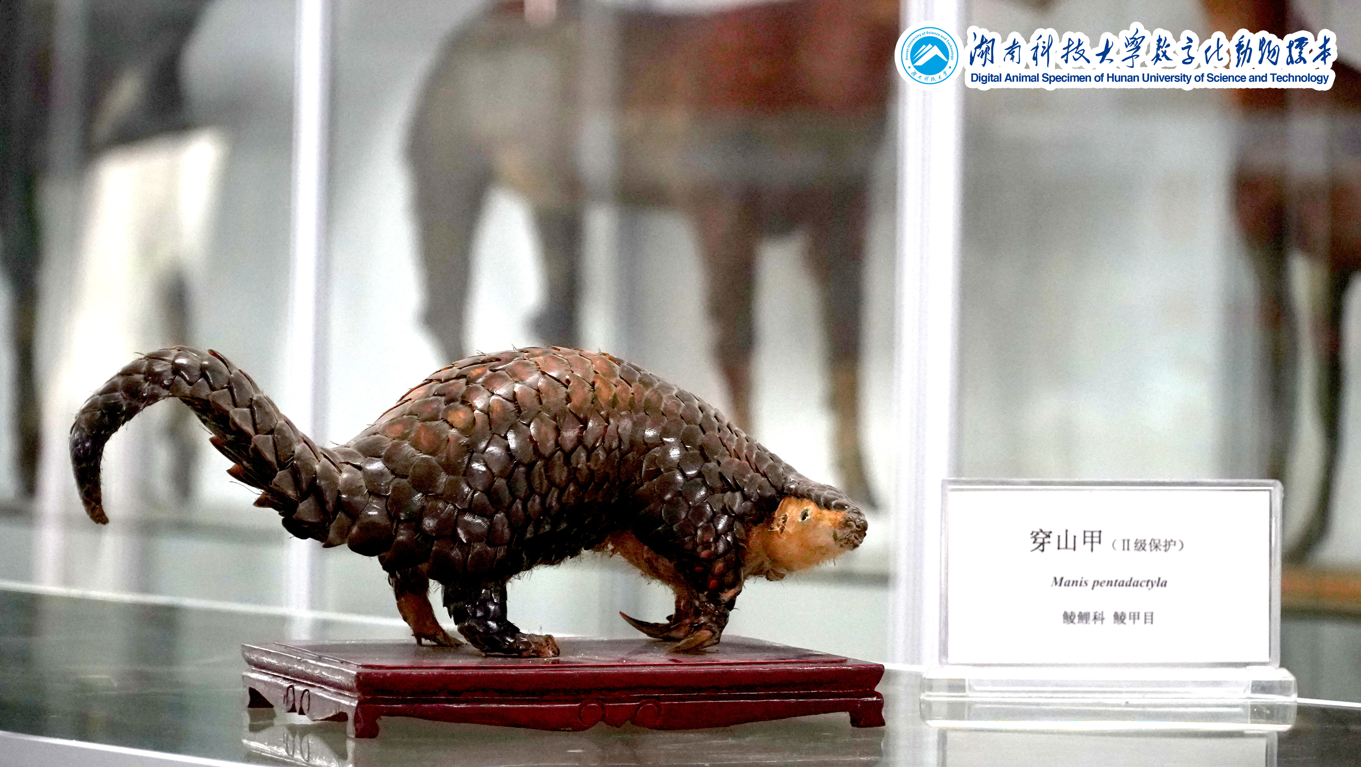 穿山甲(Manis pentadactyla):隶属于哺乳纲鳞甲目、穿山甲科,国家一级保护动物。头体长42-92厘米,尾长28-35厘米,体重2-7千克;鳞片与体轴平行,共15-18列。尾上另有纵向鳞片9-10 片。鳞片棕褐色,老年兽的鳞片边缘橙褐或灰褐色,幼兽尚未角化的鳞片呈黄色。吻细长,脑颅大,呈圆锥形,具有一双小眼睛,形体狭长,全身有鳞甲,四肢粗短,尾扁平而长,背面略隆起。舌长,无齿,耳不发达。足具5趾,并有强爪;前足爪长,尤以中间第3爪特长,后足爪较短小,全身鳞甲如瓦状。栖息于丘陵、山麓、平原的树林潮湿地带喜,炎热,能爬树。以长舌舐食白蚁、蚁、蜜蜂或其他昆虫。分布于不丹、中国、印度、老挝人民民主共和国、缅甸、尼泊尔、泰国和越南。穿山甲具有较高的药用价值,其鳞片能够治疗哺乳期妇女的皮肤状况,改善血液循环和刺激乳汁分泌等。该标本于20世纪90年代通过正规途径购得。