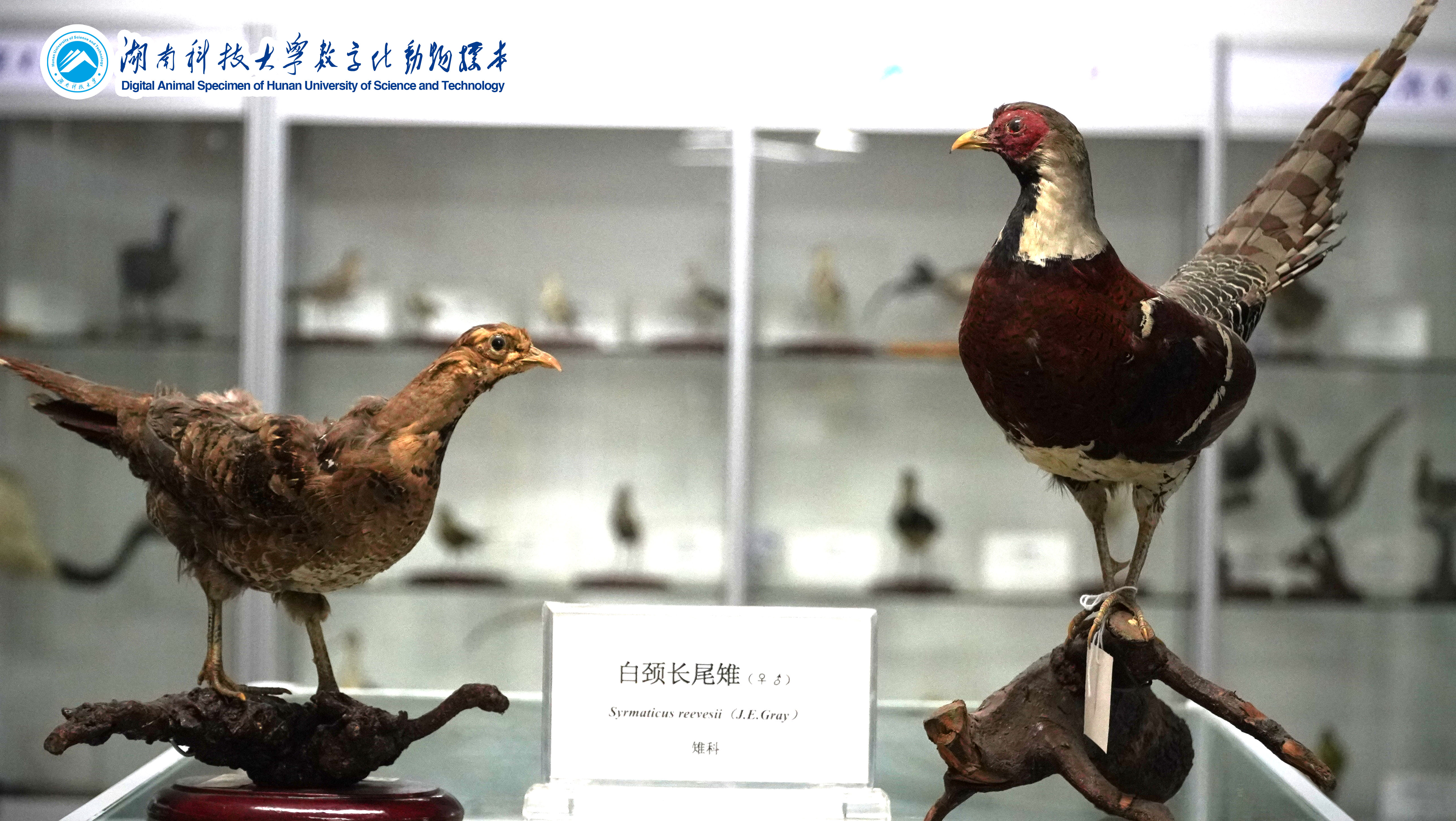 白颈长尾雉(Syrmaticus ellioti):隶属于鸟纲鸡形目、稚科,国家一级保护动物。体长81厘米,体型大小和雉鸡相似。雄鸟头灰褐色,颈白色,脸鲜红色,其上后缘有一显著白纹,上背、胸和两翅栗色,上背和翅上均具1条宽阔的白色带,极为醒目;下背和腰黑色而具白斑;腹白色,尾灰色而具宽阔栗斑。雌鸟体羽大都棕褐色,上体满杂以黑色斑,背具白色矢状斑;喉和前颈黑色,腹棕白色,外侧尾羽大都栗色。主要以植物叶、茎、芽、花、果实、种子为食,也吃昆虫等动物性食物。分布于中国长江以南的江西、安徽南部、浙江西部、福建北部、湖南、贵州东部及广东北部的山林。此标本于20世纪90年代通过正规途径购得。
