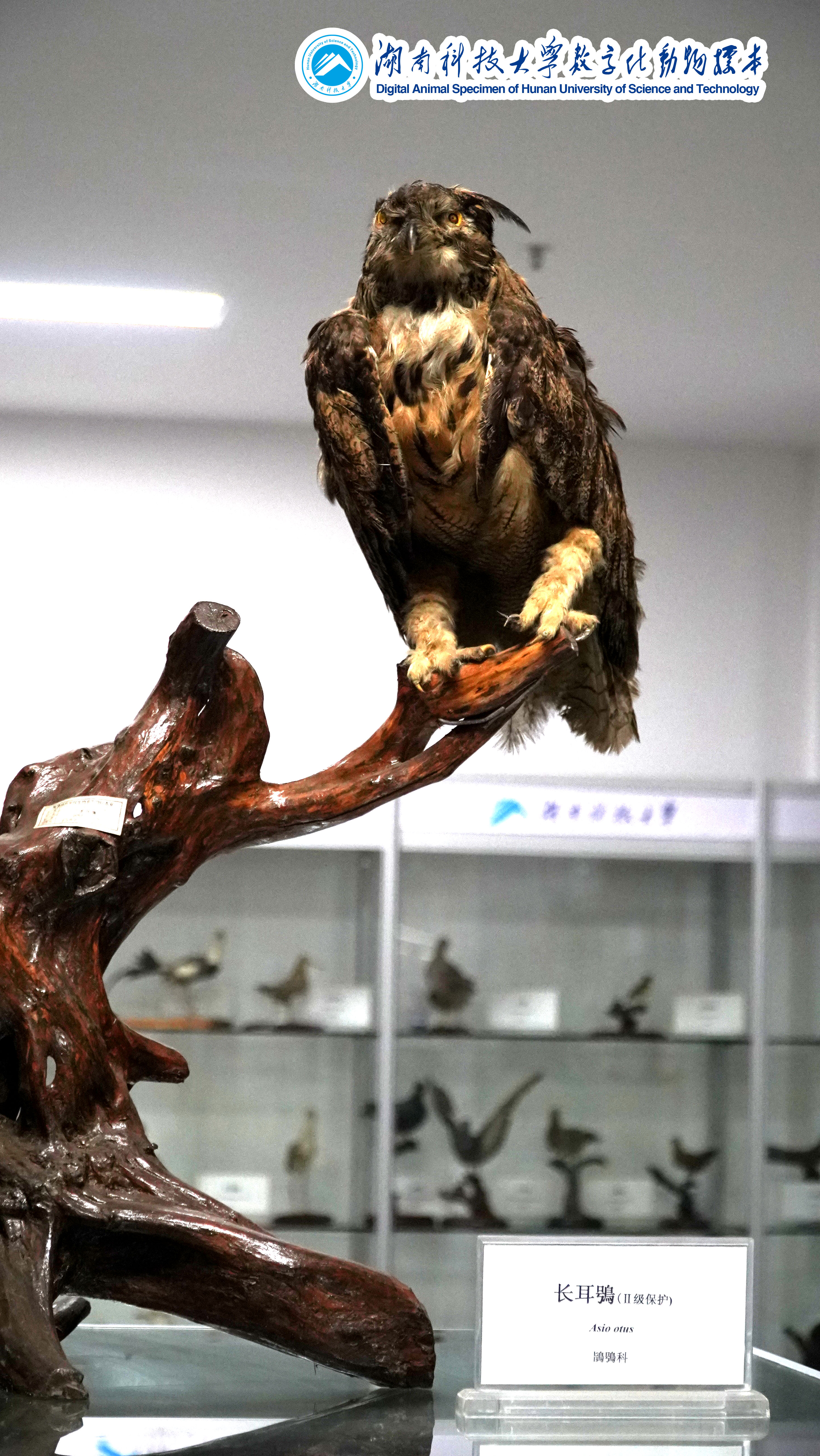 长耳鸮(Asio otus):隶属于鸟纲鸮形目、鸱鸮科,国家二级保护动物。耳羽簇长,位于头顶两侧,竖直如耳。面盘显著,棕黄色,皱翎完整,白色而缀有黑褐色。上体棕黄色,而密杂以粗著的黑褐色羽干纹;颏白色,其余下体棕白色而具粗著的黑褐色羽干纹。腹以下羽干纹两侧具树枝状的横枝。跗蹠和趾密被棕黄色羽,眼橙红色。长耳鸮喜欢栖息于针叶林、针阔混交林和阔叶林等各种类型的森林中,也出现于林缘疏林、农田防护林和城市公园的林地中。以鼠类为食,也吃鸟、鱼、蛙和昆虫。长耳鸮广泛分布于世界许多国家和我国。该标本于20世纪90年代通过正规途径购得。