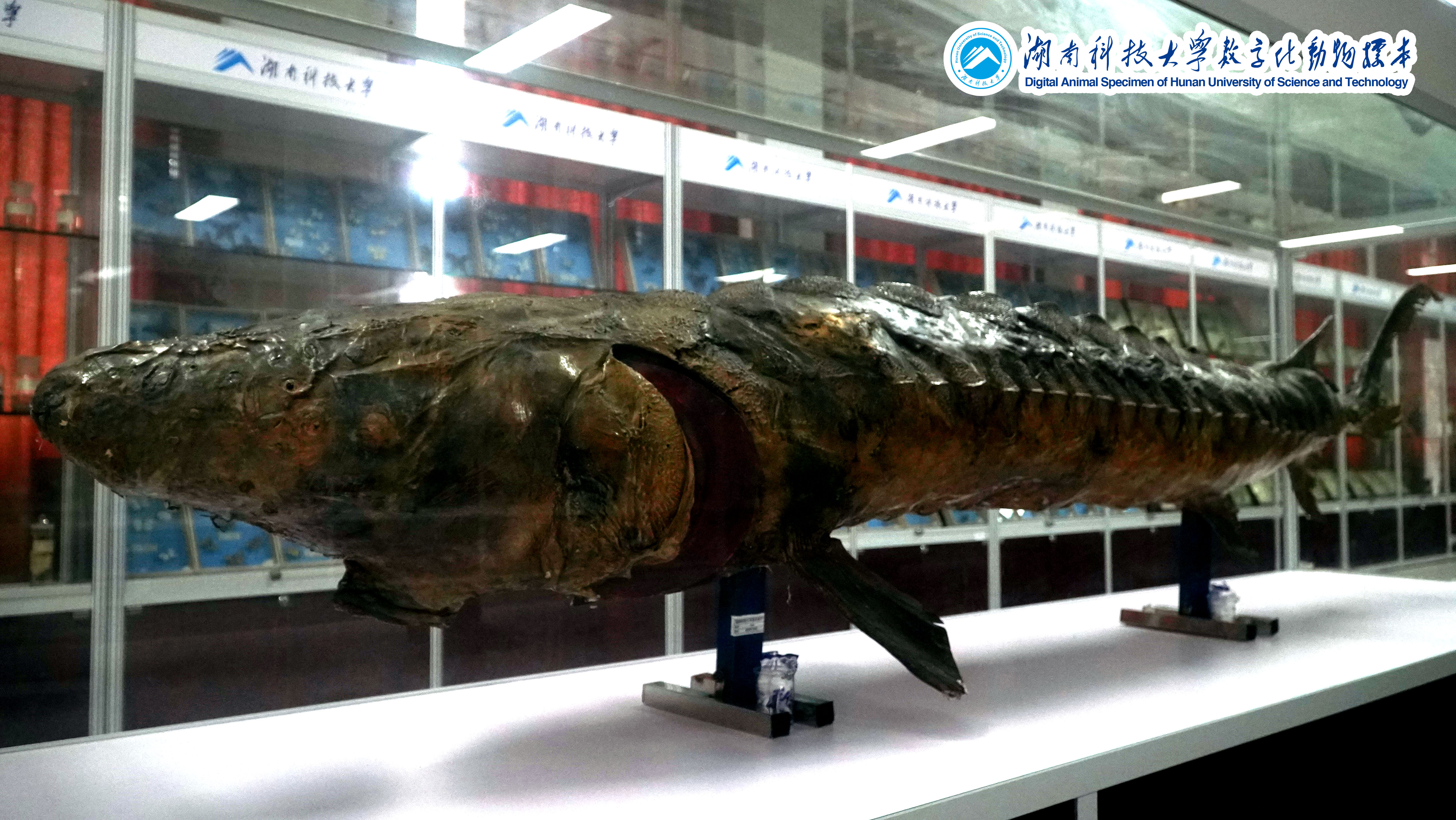 中华鲟(Acipenser sinensis):隶属于硬骨鱼纲鲟形目、鲟科,国家一级保护动物,也是活化石,有“水中大熊猫”之称。常见个体50-300千克,最大个体可达600千克,是长江中最大的鱼,故有“长江鱼王”之称。体呈纺锤形,头尖吻长,口前有4条吻须,口位在腹面,有伸缩性,并能伸成筒状,体被覆五行大而硬的骨鳞,背面一行,体侧和腹侧各两行。尾鳍为歪尾型,偶鳍具宽阔基部,背鳍与臀鳍相对。夏秋两季,生活在长江口外浅海域的中华鲟洄游到长江,历经3000多公里的溯流博击,才回到金沙江一带产卵繁殖。中华鲟生命周期较长,最长寿命可达40龄。该标本采于湖南洞庭湖,估计是洄游时误入湖中,被湖区渔民不慎捕到并致死,只好做成标本。