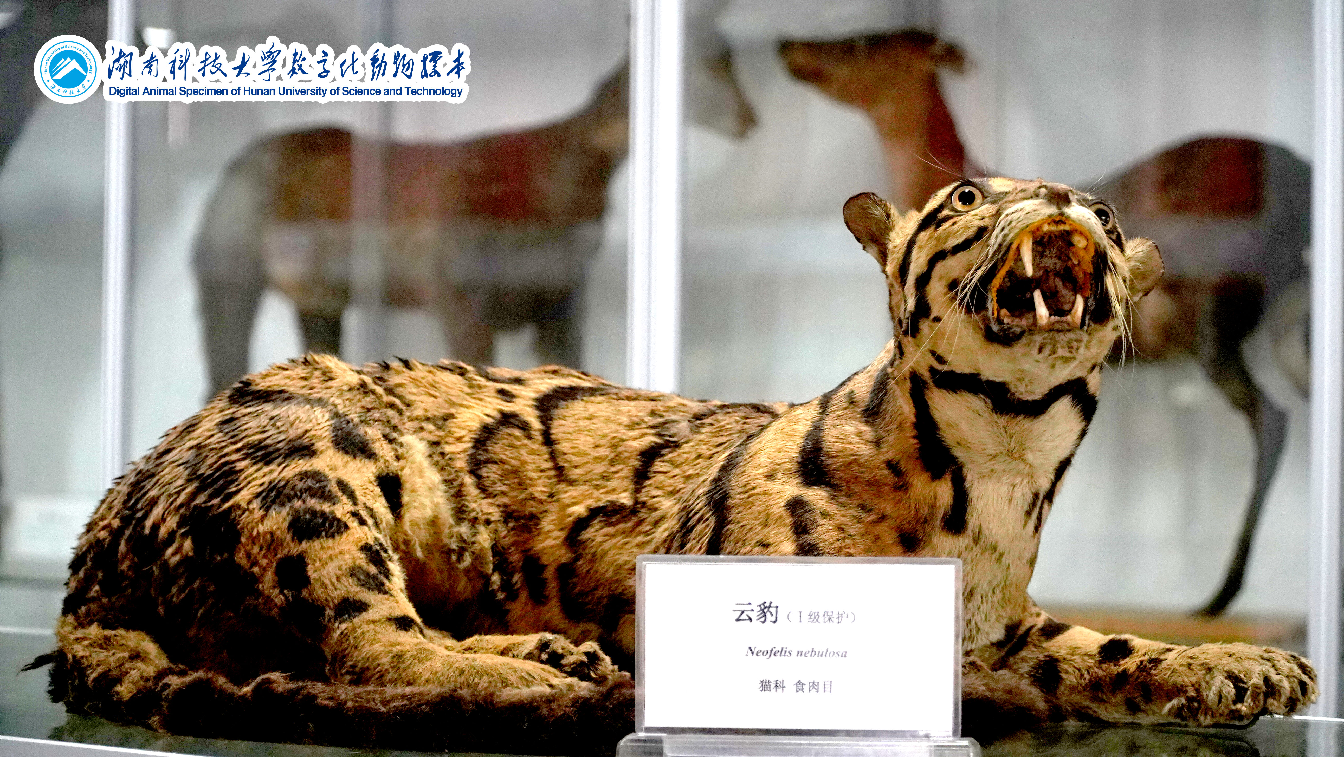 云豹(Neofelis nebulosa): 隶属于哺乳纲食肉目、猫科,国家一级保护动物。体长约70-110厘米,尾长约70-90厘米,体重约16-40千克,为豹亚科最小者。身体两侧有6个云状的暗色斑纹,故名。瞳孔长方形,收缩时纺锤形,犬齿锋利,与前臼齿之间的缝隙较大,在现存猫科动物中长度比例最大,能够咬杀较大猎物,此点与史前已灭绝的剑齿虎相似。 通常夜间活动,善爬树,常从树上跃下捕食猴、鸟、鼠、野兔、小鹿等小型哺乳动物。广泛分布于亚洲的东南部。云豹皮非常美丽,受到上流人士的追捧,导致云豹大量被猎杀。该标本于20世纪90年代通过正规途径购得。
