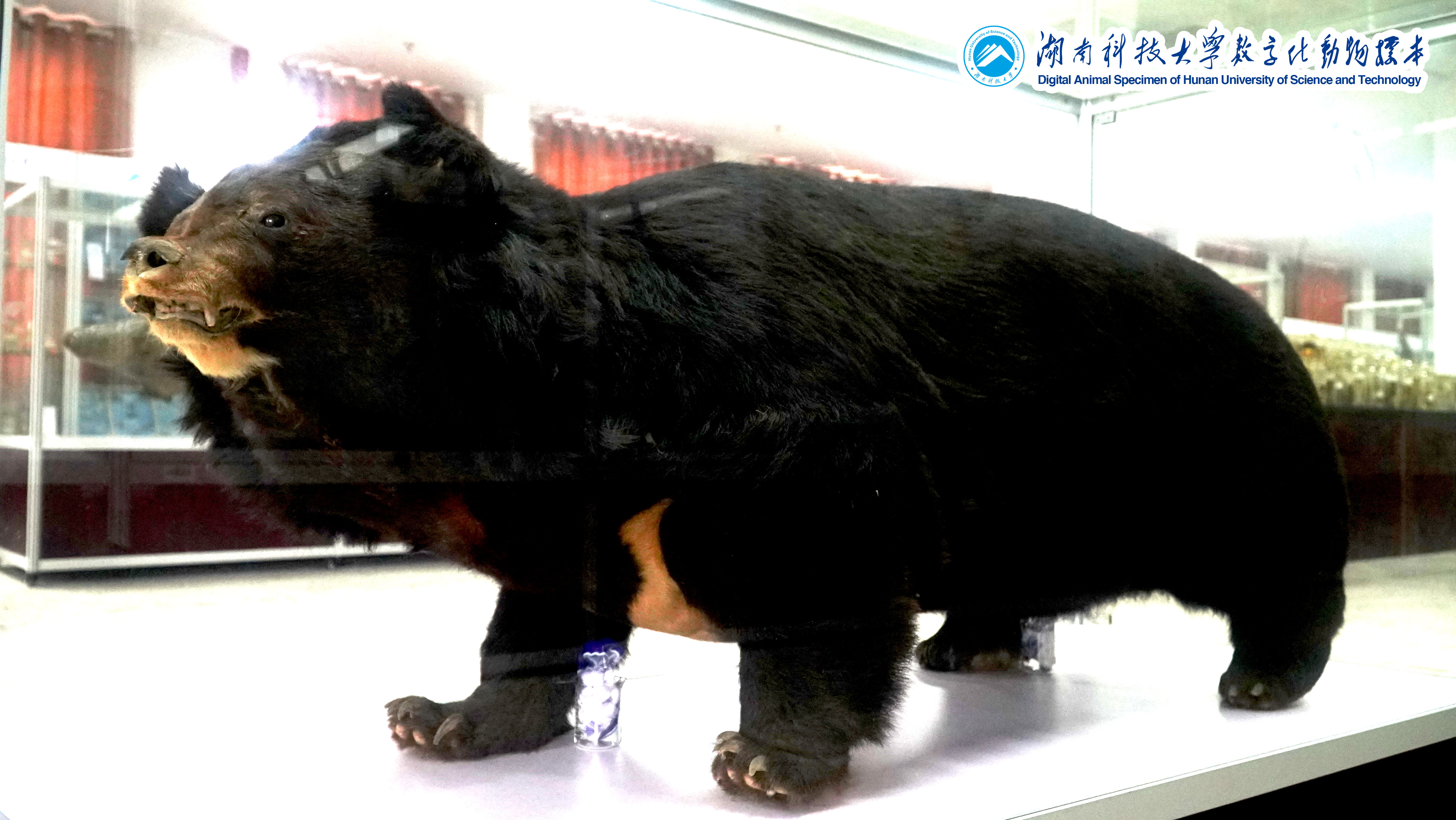黑熊(Ursus thibetanus):隶属于哺乳纲食肉目、熊科;国家二级保护动物。体长110-190厘米;肩高70-100厘米;体重40-200千克。黑熊体毛黑亮而长,下颏白色,胸部有一块"V"字形白斑。头圆,耳大,眼小,吻短而尖,鼻端裸露,足垫厚实,前后足具5趾,爪尖锐不能伸缩。常栖息于山地森林,主要在白天活动,善爬树,游泳;能直立行走;北方的黑熊有冬眠习性。黑熊是标准的杂食性动物,且以植物性食物为主。分布于欧亚大陆的东部、台湾、日本等地的森林地带。黑熊有较高的药用价值,熊胆可治肝火导致的目赤肿痛、咽喉肿痛等。该标本采于1992年,来自湖南湘西,因那时保护意识不强,被山里猎户捕杀;获悉后从林管部门购得并由本室老师制作而成。