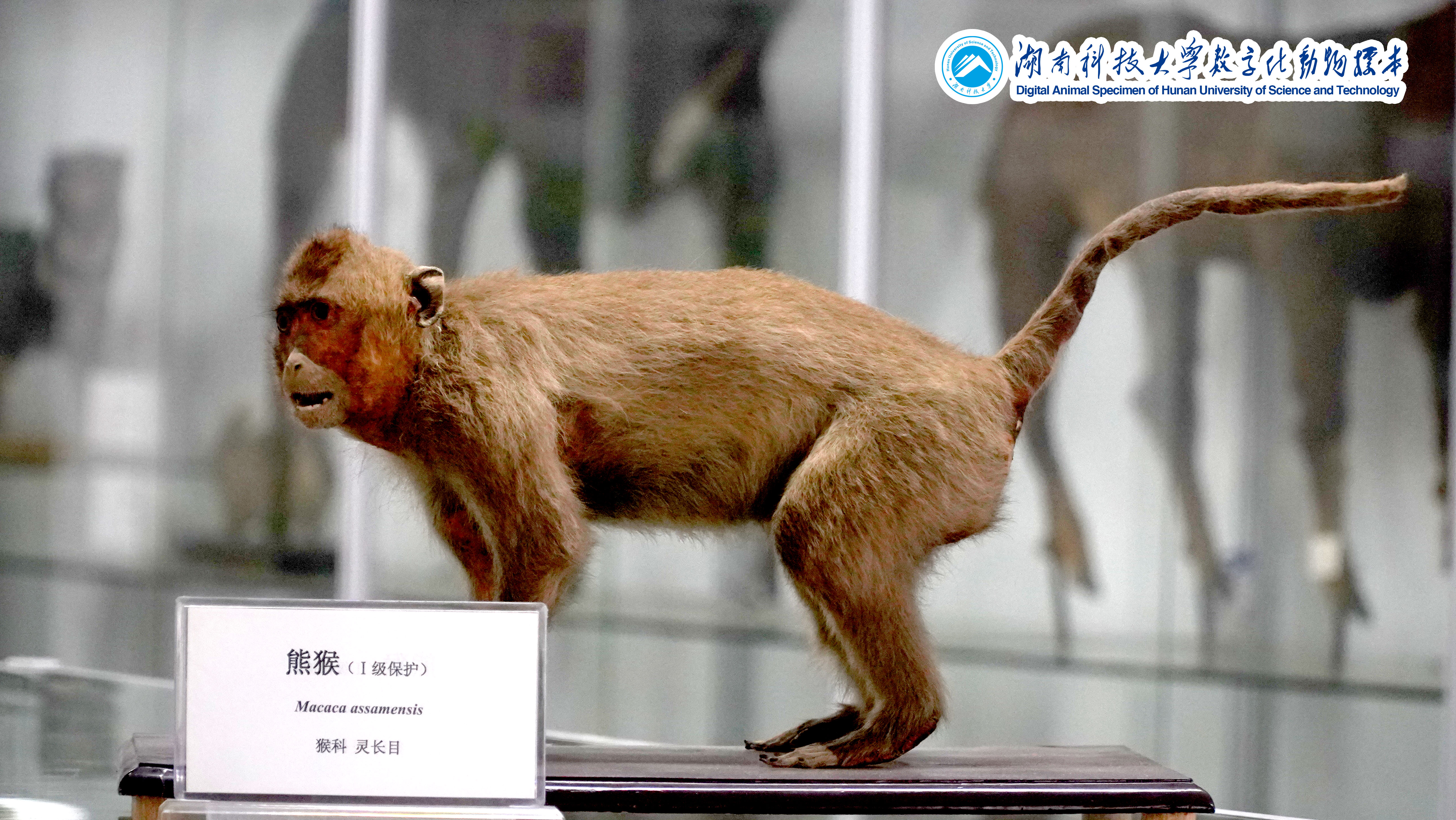 熊猴(Macaca assamensis):隶属于哺乳纲灵长目、猴科,国家一级保护动物。体型大小与猕猴相似,体重10-15kg,体长500-700mm;尾长约为体长的1/3。与猕猴的不同在于颜面部相对较长,眉弓较高而突出。熊猴为喜马拉雅山区和印度支那地区的特有种。主要栖于季风常绿阔叶林、落叶阔叶林、针阔混交林或高山暗针叶林。熊猴栖居在西藏东南部和云南西北部,栖居生境的海拔多在2500米左右。主要以野果及植物的鲜枝嫩叶为食物,也食部分昆虫、两栖动物和小型鸟类。分布于中国、印度、尼泊尔、不丹、缅甸北部、泰国北部、老挝和越南。该标本于20世纪90年代通过正规途径购得。