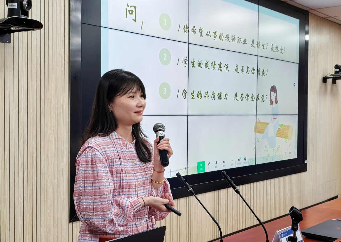 活动开篇,邓娟老师以教师职业是谋生还是热爱?学生的成绩高低,是否与教师有益?学生的品质能力,是否教师会在意?三个问题引发听众对教育初心的思考。
